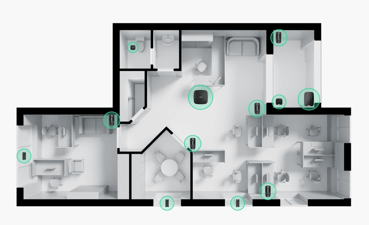 The Ajax intrusion detection devices consist of door contacts, glass breaking sensors, tilt and shock sensors, motion detectors, motion detectors with built-in photo-on-demand cameras and perimeter protection. These devices connect to the Ajax hub which provides alerts and alarms when triggered or integration where devices are interlinked with each other (see Integration). When an alarm or detection device is activated, a mixture of internal and external sounders are triggered and notifications sent to users with the free to use mobile device app.